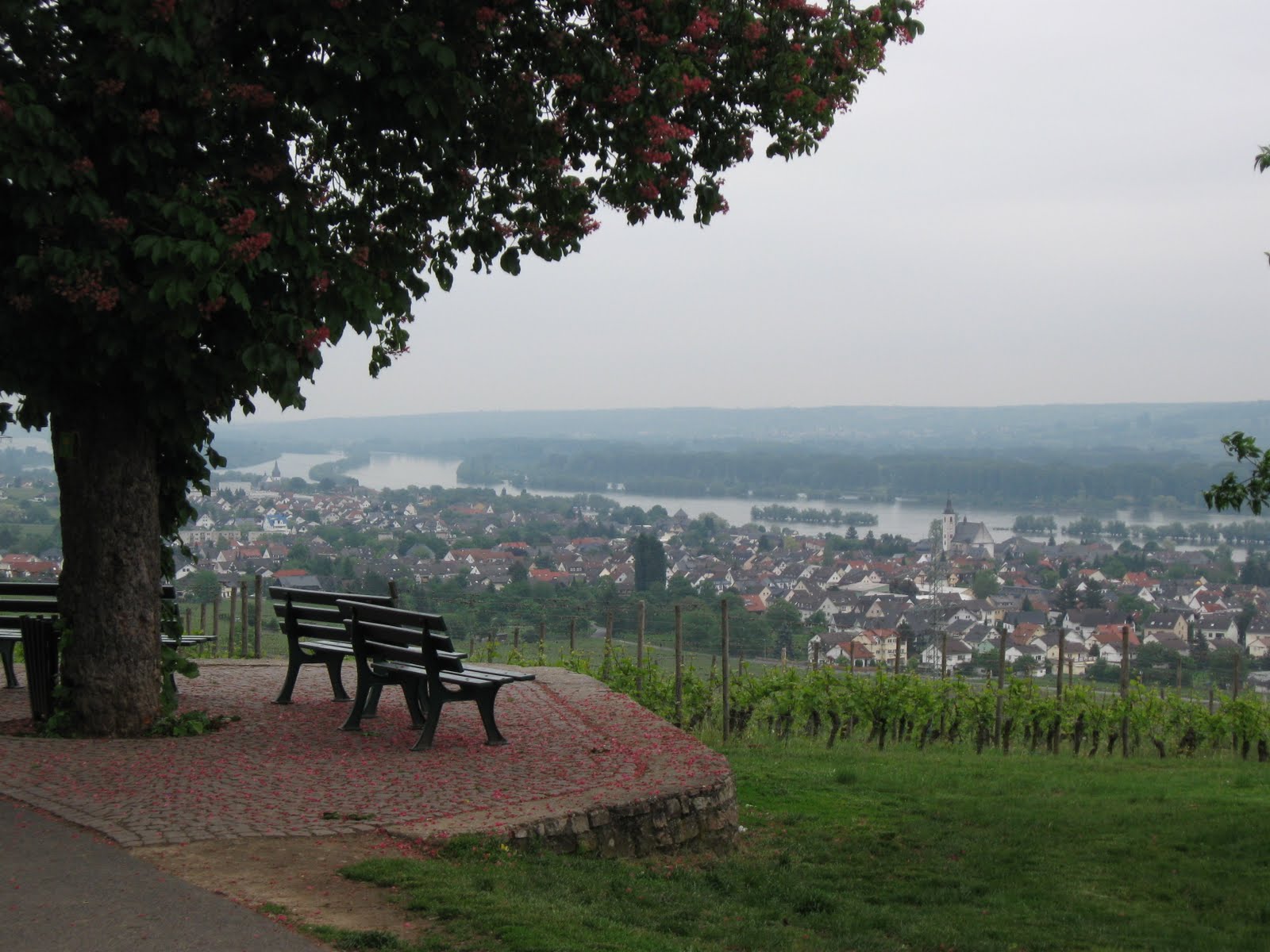 With this view a seating area is a given. Located on a hill top, Schloss Johannisberg on the Rhine River in Germany, has magnificent views of the river valley and quaint villages. This seating area sits at the end of a long walk past the chapel and into the vineyards.